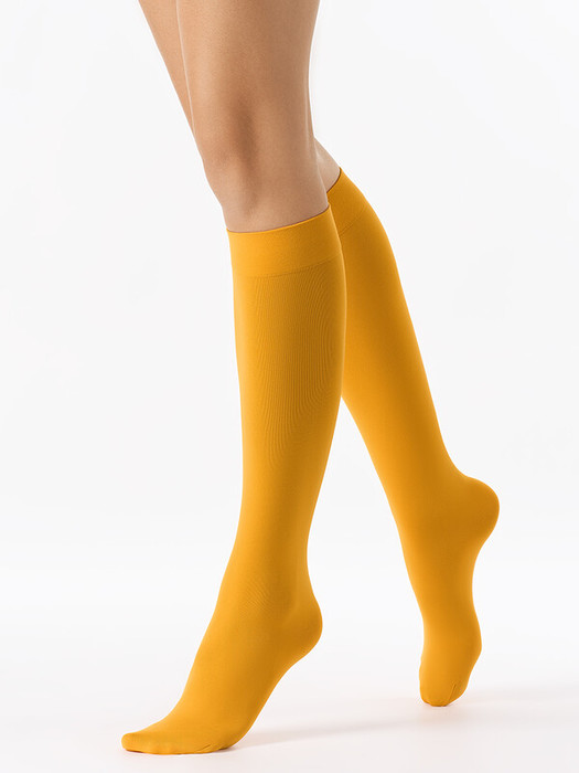 Женские плотные цветные  эластичные гольфы из микрофибры с широкой резинкой. В составе премиальный Nylon 6.6, который подходит даже для самой чувствительной кожи и обеспечивает более высокую прочность, а также мягкая микрофибра, которая приятно ощущается на теле благодаря бархатистой текстуре. Специальная технология 3D вязки способствует превосходному облеганию. Удобная резинка  «ТОП комфорт» и укрепленный мысок. В палитре представлены насыщенные и классические оттенки.