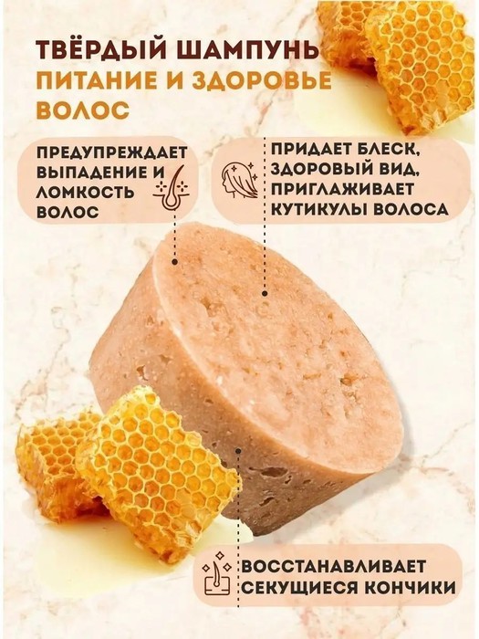 Твердый шампунь натуральный, максимальное восстановление и питание, МЕДОВЫЙ, для слабых, ломких, тусклых волос