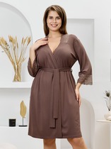 Халат из гладкокрашеного трикотажного вискозного полотна, на запахе, с втачными рукавами 3/4 длины, кружевными манжетами, притачной планкой по бортовым срезам и съемным поясом, продетым через две шлевки в боковых швах. Спинка с кружевной притачной кокеткой - V-образной формы, бортовая планка с кружевными вставками, переходящими на полочку.