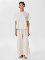 Халат из вискозы, запашной с поясом. Широкие рукава чуть ниже локтя, общая длина чуть выше колен. Две вариации по цвету — синий с розовыми цветами либо черный в белый горох. Размеры от 44 до 54. Возможно приобретение товара в розницу.