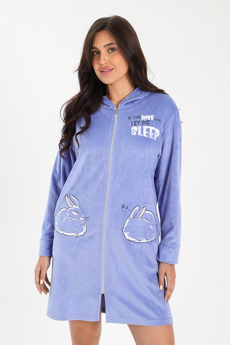 Халат молодежный из трикотажного полотна «вельмонд», прямого силуэта, с длинными втачными рукавами, капюшоном, карманами в боковых швах, и центральной бортовой застежкой на тесьму «молния». В области карманов и в верхней части левой полочки выполнена вышивка – аппликация.