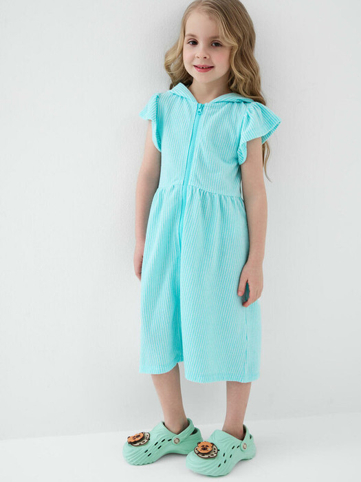 Детский махровый халат на молнии для девочки. Выполненный из мягкой хлопковой трикотажной ткани. Капюшон, короткие рукава с оборками и расклешённый низ. Центральная застёжка-молния делает халат удобным для повседневного использования. Светлый мятный цвет в белую полоску.