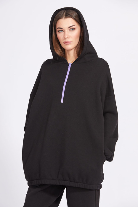 Джемпер выполнен из трикотажного полотна на флисе. Джемпер прямого силуэта, покроя оверзайз, длиной ниже линии бедер. Застежка спереди на молнию. Спинка цельная. Горловина обработана капюшоном. Плечевой шов спущен. Рукав одношовный. Низ рукава и джемпера на эластичной тесьме. В боковых швах карманы. Джемпер декорирован по спинке вышивкой "CULTURE".