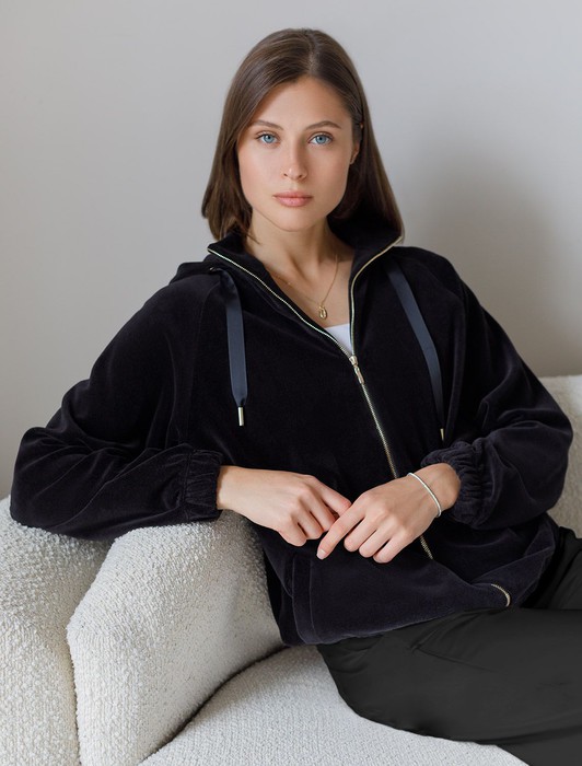 Состав: 80%Хлопок 20%ПЭ Плотность: 240 Г/м2 Параметры модели на первом фото: Рост 170, бюст 83, талия 64, бедра 88Худи на двухсторонней молнии выполнено из бархатистого велюра. Модель дополнена резинкой по низу и боковыми карманами. Легкий и мягкий материал с матовой фактурой придает изделию нежность и комфорт. Хорошо держит тепло и форму – идеальное решение для домашнего отдыха. Сочетается в костюме с брюками D44.117