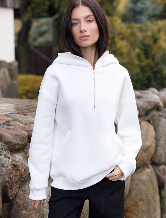 Состав: 80%Хлопок 20%ПЭ Плотность: 320 Г/м2 Параметры модели на первом фото: Рост 170, бюст 89, талия 63, бедра 92Худи с воротом на молнии выполнено из премиального футера трехнитки с теплым начесом. Модель дополнена боковыми карманами и золотистой фурнитурой, что поддерживает актуальный стиль спорт-шик. Свободный крой подходит для любой фигуры. Ранней осенью или поздней весной можно носить в качестве верхней одежды. Сочетается в костюме с брюками D44.133.