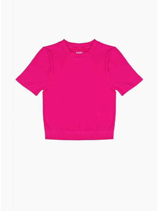 Футболка из полиамида, цвета фуксии, с короткими рукавами, с небольшим горлом, в рубчик, облегающая, укороченная.