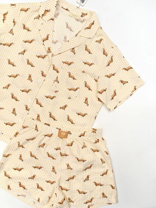Пижама в молочном оттенке с принтом. Сшита из нежной к коже вискозе и дышащего хлопка, подходит для любого времени года. Рубашка прямого кроя с пуговицами в тон и аккуратным нагрудным карманом. Шорты с плотной эластичной лентой для более собранного силуэта