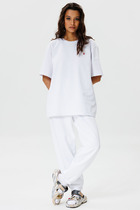 Брюки прямого свободного кроя имеют на талии мягкую эластичную широкую резинку.