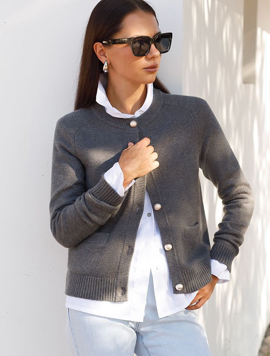 Состав: 52%ПАН (акрил) 33%ПЭ 8%ПУ 7%Кашемир Плотность: 7 GG Размер товара на первом фото: 42Кардиган выполнен из мягкой меланжевой пряжи с добавлением кашемира. Модель прямого силуэта гармонично впишется в любой образ с брюками, юбками и джинсами. Застежка на пуговицы в жемчужно-золотистом оттенке. Изделие очень приятное к телу, совершенно не колется и отлично сохраняет тепло. Сочетается в костюме с брюками D38.013, D38.012 и юбкой D36.016