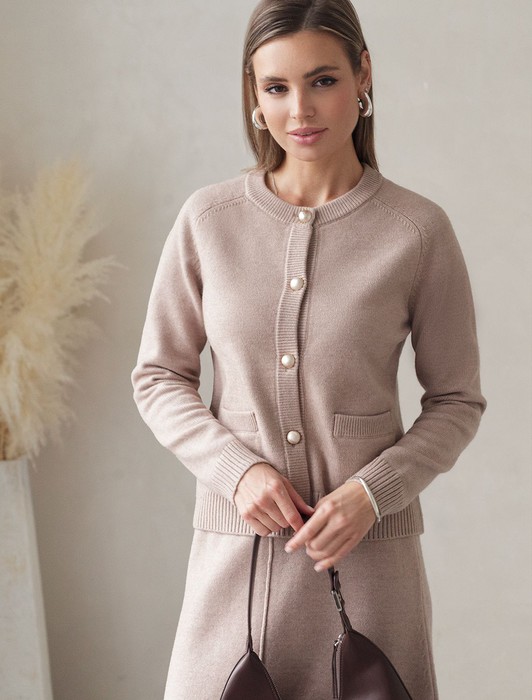Состав: 52%ПАН (акрил) 33%ПЭ 8%ПУ 7%Кашемир Плотность: 7 GG Размер товара на первом фото: 42Кардиган выполнен из мягкой меланжевой пряжи с добавлением кашемира. Модель прямого силуэта гармонично впишется в любой образ с брюками, юбками и джинсами. Застежка на пуговицы в жемчужно-золотистом оттенке. Изделие очень приятное к телу, совершенно не колется и отлично сохраняет тепло. Сочетается в костюме с брюками D38.013, D38.012 и юбкой D36.016