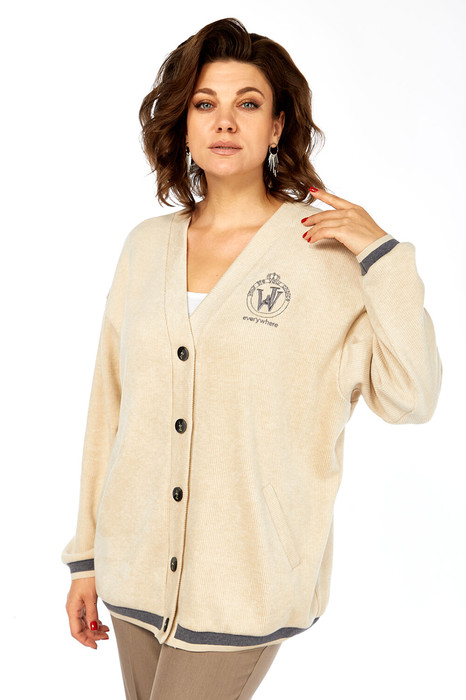 Кардиган женский, изготовлен из трикотажного полотна. Горловина V-образной формы, застежка отрезная планка на петли и пуговицы. Карманы с листочками. По низу изделия и низу рукавов-декоративные довязы. Спинка цельнокроенная. Рукава спущенные длинные. Отделочный элемент — вышивка на детали переда.