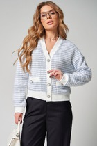 Застежка центральная на петли и пуговицы. На деталях переда накладные карманы с притачными планками, на которые прикреплены декоративные пуговицы. Рукава втачные одношовные длинные, с притачными манжетами. Линия плеча спущена. По низу кардигана, по краю борта и горловине - притачная планка.