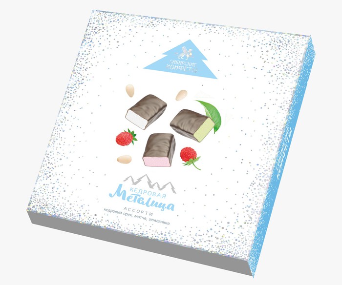 «Кедровая метелица» - это нежное молочное пралине с добавлением кедрового ореха, лесной земляники и японского чая матча, покрытое шоколадной глазурью.
