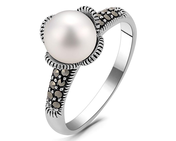 Вес: 4.31 г Вставка: Марказит Цвет камня: Белый Производство: Таиланд Покрытие: Оксидирование Размер колец: 17181919.5 Количество: 8Кольцо, арт.656404 Серебро Серебро 875, р. 19.5, 4,31 гр., жемчуг , марказит