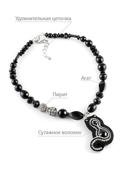 Агат, пирит, хрустальное стекло, сутажное волокно, кристаллы Preciosa, латунь. Гальваническое покрытие: родий.