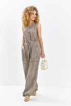Комбинезон женский отрезной по линии талии, со спущенной линией плеча, со съёмным ремнём продергивающийся через шлёвки по боковым. Лиф переда с застёжкой на петли, пуговицы, по линии талии сборка.