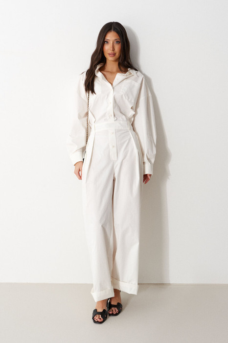 Комбинезон свободного кроя. Выполнен из хлопковой ткани молочного (тёплого белого) цвета. Без подкладки. Воротник отложной. Застёжка центральная - пуговицы. На уровне линии груди накладные карманы. Рукав втачной, спущенный, с манжетом с пуговицей. Пояс частично на резинке (резинка по задней части), со шлёвками. Брюки по переду со складками. По переду имитация застёжки. В боковых швах карманы. Длина рукава от линии втачивания 60 см. Длина спинки (до пояса) верха 48 см. Длина брючины по боковому шву (с учётом пояса) 110 см