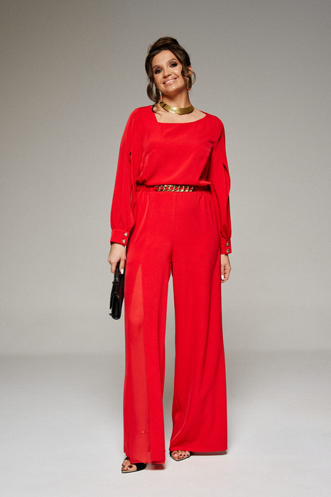 Справа верхняя передняя половинка разрезная по центру: от уровня бедер до низа обработан разрез, из-под которого выглядывает внутренняя отделочная деталь из шифона. Левая половинка брюк комбинезона цельная. Сзади по брюкам комбинезона от пояса расположены вытачки.