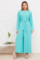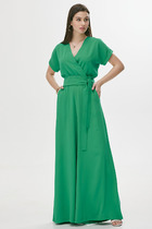 Комбинезон женский летний свободного кроя с широкими укороченными брюками. По переду изделие отрезное по линии талии. На брючинах имеются карманы( накладной с клапаном и в боковом шве). По спинке изделия расположены накладные клапаны.  комбинезон без застежки. Изделие дополнены съемным поясом.