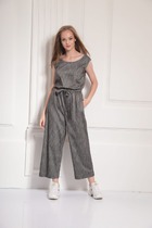 Комбинезон имеет застежку молнию по центру, с дизайнерскими треугольными подрезами и вышивку - логотип в цвет на левом переде. Силуэт приталенный  - за счет резинки по спинке и завязок на переде. Брюки заужены, с удобными боковыми карманами, низ брюк присобран на резинку