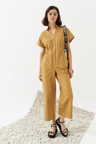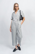 Комбинезон с застежкой на навесную петлю и пуговицу по горловине спинки, с цельнокроенным рукавом- крылышко. Лиф переда с V-образным вырезом горловины, полочки расположены на запах. Лиф спинки со средним швом. Комбинезон с втачным поясом. Пояс присборен эластичной нитью- венгеркой.