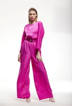 Комбинезон женский из штапеля, свободного силуэта, со спущенной линией плеча, с втачным поясом на уровне линии талии, в который вставлена эластичная тесьма. Лиф детали переда комбинезона со средним швом, на уровне талии обработаны 2 складки. Нижние части с рельефными швами, которые заканчиваются разрезами, в боковых швах обработаны наклонные карманы. Лиф детали спинки комбинезона с запахом, вверху которого обработан разрез с застежкой на 1 навесную петлю и пуговицу, по середине застежка на 1 потайную кнопку. На нижней части по шву притачивания пояса обработаны по одной вытачке на каждой половинке. Рукава втачные двухшовные, короткие, с разрезами. Вырез горловины комбинезона «V-образной» формы, обработан обтачкой.