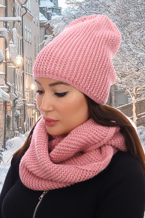 Уютный вязаный комплект - шапка без отворота и объемный шарф-комут с нитями люрекса