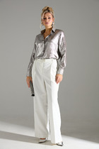 Блуза прямого свободного силуэта с рубашечным воротником на стойке и зауженным рукавом на манжете со спущенной линией плеча. Спереди на функциональной планке петли/пуговицы. Спинка изделия имеет горизонтальную плечевую кокетку (высота кокетки 20 см) и встречную складку для свободы движения. По плечевому шву заложена складка. Низ блузона слегка фигурный: спинка и полочка чуть длиннее бокового шва. Длина изделия блузона по спинке 73 см. Рукав рубашечный одношовный завершается манжетой (высота 5 см) с застежкой петля/пуговица. Длина спущенного плечевого шва 33 см. Длина рукава с манжетой 41 см.