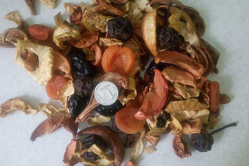 Состав: Яблоко 30% Груша сушеная 25% Груша дичка 10% Изюм 10% Урюк 15% Чернослив 10% Может содержать кизил, сушёную вишню, дикие яблочки. МЫТЬ ПЕРЕД ЕДОЙ!