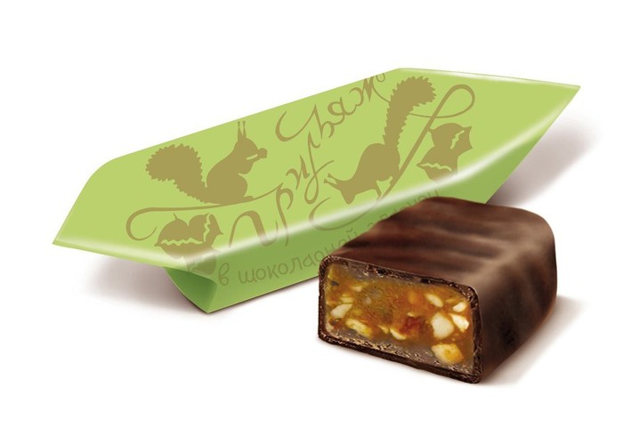 Традиционный «Грильяж в шоколаде» от фабрики «Рот Фронт» – тягучая полупрозрачная карамель, в которой увязли осколки дробленых лесных орехов. Вязкая сахарно-ореховая масса покрыта темной шоколадной глазурью и упакована в светло-зеленый бумажный фантик с оригинальными чуть золотистыми силуэтами белочек.