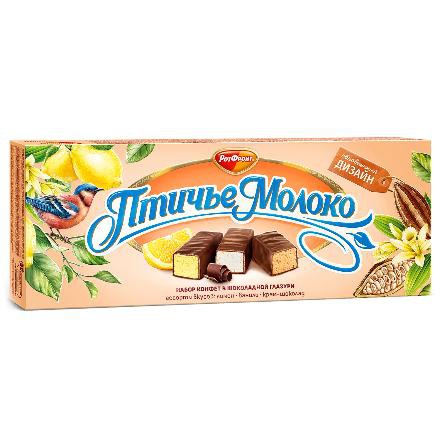 Набор конфет «Птичье молоко» от фабрики «Рот Фронт» – нежное воздушное суфле, покрытое шоколадной глазурью и припудренное какао-порошком. Три утонченных вкуса: классическое сливочное суфле с нежными оттенками пломбира во вкусе, лимонное с насыщенным цитрусовым ароматом и шоколадное, с мягкими оттенками шоколадной пряности.