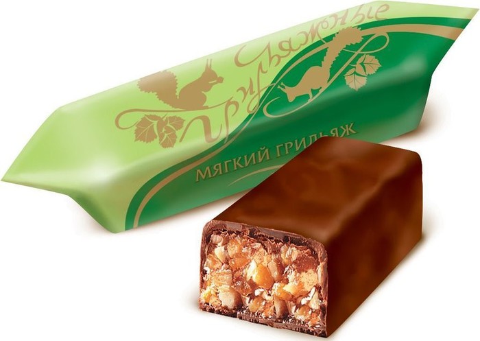 Конфеты «Мягкий грильяж» от фабрики «Красный Октябрь» – классический грильяж из дробленого арахиса, покрытый шоколадной глазурью. За счет большого количества фруктового повидла, добавленного в карамель, грильяж получается мягким, вязким, его легко раскусить, не дожидаясь, пока карамель растает, и наслаждаться ореховым хрустом. А в сочетании с горячим чаем грильяжные конфеты размягчаются еще быстрее, раскрывая все грани орехово-карамельного вкуса и аромата с яркими шоколадными оттенками.