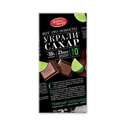 Великолепный темный пористый шоколад «Красный Октябрь» без сахара с криспами лайма. В составе только натуральные ингредиенты, создан для ценителей темного шоколада. Без вреда для фигуры: меньше углеводов на 30%, а в одной дольке шоколада всего 23 ккал, без интенсивных подсластителей, без вреда для ЖКТ. Отличное начало дня с чашечкой кофе!