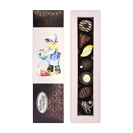 Набор конфет «Старинная открытка» – конфеты из темного, молочного и белого шоколада разнообразной формы с оригинальными начинками. Изысканная глазировка и рельефное декорирование выполнены вручную. Особая прелесть – изящный пенал из плотного картона с узорчатым тиснением и разнообразными картинками, повторяющими сюжеты старинных поздравительных открыток. Замечательный сладкий подарок к любому событию или празднику.