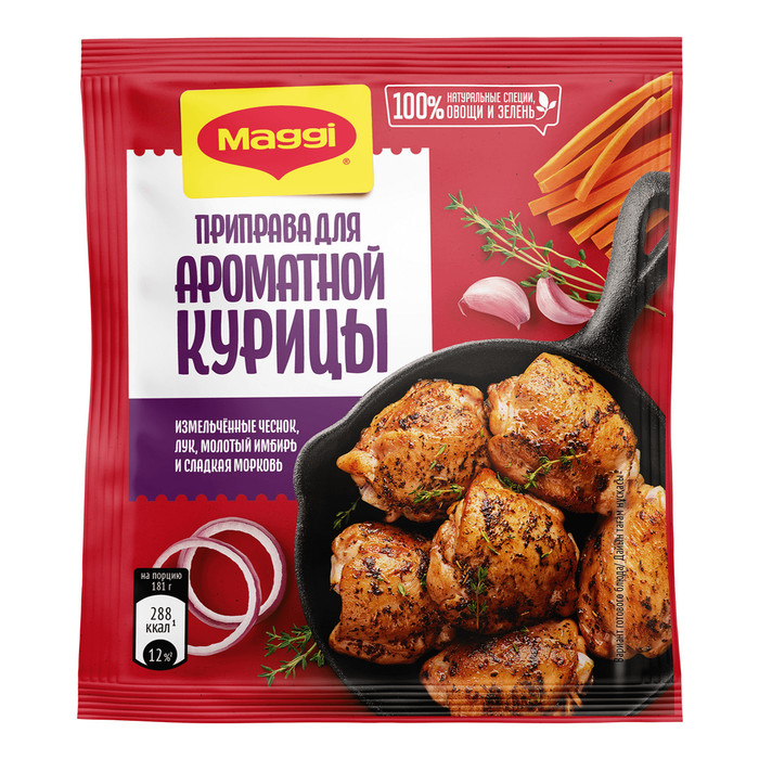 «В этой приправе я подобрал специальную композицию натуральных трав, овощей и специй, чтобы наилучшим образом подчеркнуть аромат и вкус блюд из курицы. Измельченные чеснок и лук помогут раскрыть вкус курицы, сочетание молотого имбиря и пряных орегано, тимьяна, гвоздики и розмарина придадут душистый аромат, а молотый карри и сладкая паприка – румяный аппетитный цвет». Виссарион Михайлов, шеф-повар Магги®
