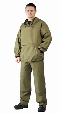 Костюм состоит из куртки и брюк Куртка - с регулируемым капюшоном , - со съемной вставкой из противомоскитной сетки на молнии, - с накладными карманами с клапаном на кнопках. - складки-ловушки на груди и рукавах - рукава с трикотажными напульсниками. - с налокотниками. - низ куртки на эластичной резинке с фиксатором Брюки - прямые с эластичной лентой в притачном поясе со шлевками, - верхними внутренними карманами на кнопках. - с эластичным шнуром на фиксаторе по низу брюк. - с наколенниками
