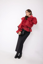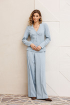 Костюм женский кофта и брюки. Кофта полуприлегающего силуэта с втачным длинным рукавом. Горловина округлой формы, обработанна при помощи окантовки. Низ рукава и низ изделия - подгибка. Брюки полуприлегающего силуэта с цельнокроенным поясом. Низ изделия подгибка.