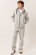 Мужской костюм. Кофта на молнии с капюшоном, по бокам карманы. Рукава на манжете. Слева на груди небольшой принт в виде надписи. Брюки на манжете. Спереди два кармана. Слева под карманом небольшой принт в виде надписи.