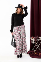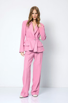 Костюм женский с брюками, сшит из кулирки. Приталенного силуэта, рукав 3/4. Горловина округлой формы, отделана бейкой. Спереди печать. Брюки на резинке, слегка зауженные, длиной до щиколотки.