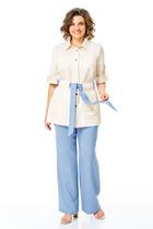 Костюм состоит из толстовки и брюк. Брюки на поясе, с карманами, с лампасами из отделочного полотна вдоль боковых швов, на резинке по низу. Толстовка прямая, свободная, с ушками на капюшоне, на поясе, длиной до середины бедра. Рукав длинный. На полочке обработан карман "кенгуру".