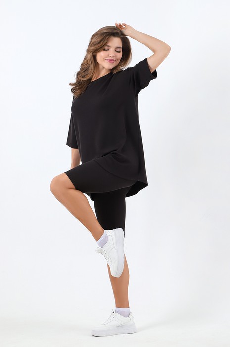 Костюм женский из гладкокрашенного трикотажного полотна в рубчик («лапша»), состоящий из футболки и леггинсов. Футболка – удлиненная, свободного покроя, со спущенной, линией плеча, короткими втачными рукавами, горловиной овальной формы, обработанной втачной планкой.Леггинсы – длиной до колен, с эластичной тесьмой по талии.