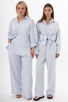 Роскошный брючный костюм, состоит из жакета и брюк. Жакет двубортный, прямого силуэта, выполнен из премиальной костюмной ткани с добавлением вискозы. Жакет полностью на премиальной подкладке, с застежкой по переду на пуговицы и функциональными карманами с клапаном. Рукав втачной, полной длины, по низу декорирован пришивными пуговицами. Брюки прямые, на поясе с резинкой и застежкой на пуговицу и молнию, в боковых швах с функциональными карманами.