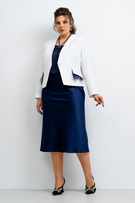Красивый и стильный костюм тройка! Костюм создает роскошный образ уместный как для торжественных случаев, так и для романтических свиданий. Жакет полуприлегающего силуэта без воротника с застёжкой на одну петлю и пуговицу. По переду нагрудные и талиевые вытачки, придающие легкое приталивание и подчеркивающие фигуру. В качестве декоративной отделки съемная тесьма с перьями и настрочные клапаны. Спинка в жакете со средним швом без особенностей. Рукав втачной, двухшовный, длинный.  Жакет на подкладке. Блузка прямого силуэта с округлым везом и нагрудными вытачками. Рукав втачной короткий. Спинка без особенностей. Юбка А-образного силуэта из плотной атласной ткани с умеренным блеском. Для максимального комфорта на эластичной ленте по талии.  Длина жакета 56 см, длина рукава 60 см, длина юбки 81см. Длина блузки 63см, длина рукава блузки 30см.