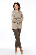 Трикотажный женский костюм из структурной ткани. Жакет прямого силуэта переду центральная застежка на 3-и петли и пуговицы и потайные кнопки. По переду накладные карманы декорированные цепью и застежкой на петлю и пуговицу. Спинка со средним швом без особенностей. Рукава втачные двухшовные. Юбка прямая длиной миди без подкладки. По правому боковому шву разрез. Для максимально комфортной посадки по поясу эластичная резинка.