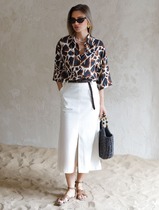 Женский костюм состоит из жакета и брюк, выполнен в романтичном повседневно-деловом стиле. Комплект отличается гармоничным сочетанием нежного цветочного принта и однотонной ткани, создавая элегантный и женственный образ. Жакет свободного силуэта выполнен из светлой ткани с мелким цветочным рисунком, который придаёт модели лёгкость и утончённость. Отложной воротник с лацканами подчеркивает классический характер изделия. Перед жакета украшен рядом контрастных декоративных пуговиц, что придаёт модели выразительность. Перед с центральной бортовой застёжкой на пять пуговиц. На переде расположены два накладных кармана с закруглёнными нижними углами, расположенные в области бедер добавляют изделию практичности и завершённости. Короткие рукава делают модель удобной для тёплого времени года.