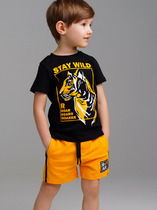 Костюм детский футболка и шорты. Футболка с принтом прямого силуэта с втачным коротким рукавом. V-образный вырез горловины обработан узким воротником. Декоративная линия плеча подчеркнута кантом из отделочного материала. Низ рукава и изделия-подгибка. Шорты прямого, свободного силуэта с притачной резинкой и карманами "хулиган". Вход в в карман подчеркнут декоративным кантом из отделочного материала. Низ подгибка. На передней половине шорт небольшой принт.