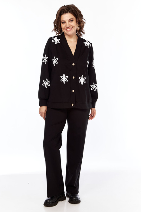 Кардиган прямого силуэта,  с центральной застёжкой по притачной планке на четыре пробивные петли и пуговицы, понизу на притачном поясе. Рукава втачные, одношовные, длинные, понизу с притачными манжетами. Декорированный по переду и рукавам вышивкой.