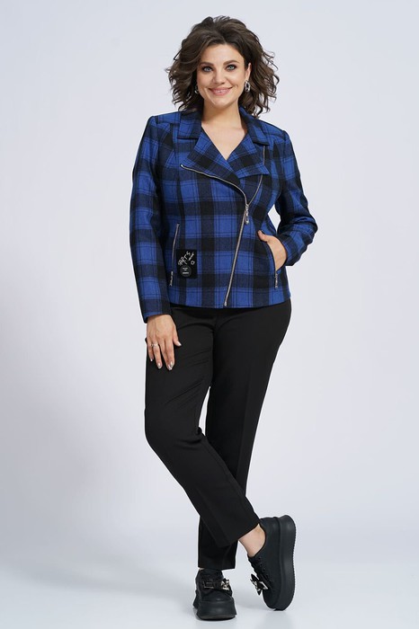 Жакет полуприлегающего силуэта, на подкладке, с ассиметричной застёжкой до верха на молнию. Декорированный по переду нашивкой.  Перед с притачными кокетками, с рельефными швами, с прорезными карманами с молнией.  Спинка с притачной кокеткой, средним швом и рельефными швами.  Рукава втачные, двухшовные, длинные.