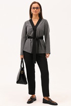 Жакет полуприлегающего силуэта, с застёжкой на петли и пуговицы, отрезной по линии талии переда. Декорирован съёмным цветком.  Перед с рельефными швами, с прорезными карманами с двумя обтачками. Спинка со средним швом и рельефными швами. Рукава втачные, одношовные, короткие, понизу имитацией цельнокроеной манжеты.