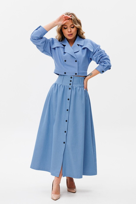Юбка женская а-силуэта на широком поясе. По переду вертикальная застежка на кнопки. В боковых швах действующие карманы.